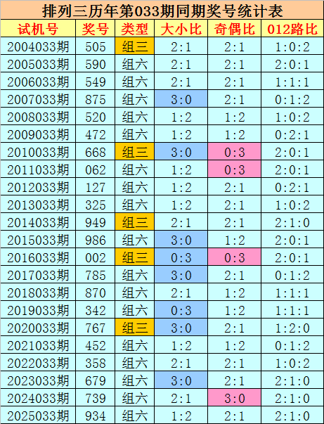 奇偶分析:历史上陈列三第033期同时奖号中,奇偶比3:0出现1期,奇偶比0:3出现3期,奇偶比1:2出现6期,奇偶比2:1出现12期,奇偶奖号总比例开出33:33,奇偶号码阐发基本捏平,本年第033期看好偶数走热,参考奇偶比1:2。