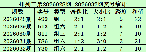 上期追思:陈设三第2026032期开奖号码为730。奖号类型为组六,奇偶比为2:1,大小比为1:2,跨度为7,和值为10。